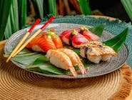 Ręcznie formowane porcje ryżu, na których umieszczony jest kawałek świeżej ryby, owoców morza lub warzywa.
