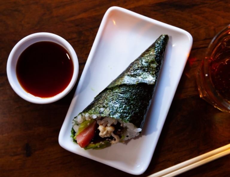 Ręcznie formowane kulki ryżu, owinięte nori lub ogórkiem, wypełnione nadzieniem.