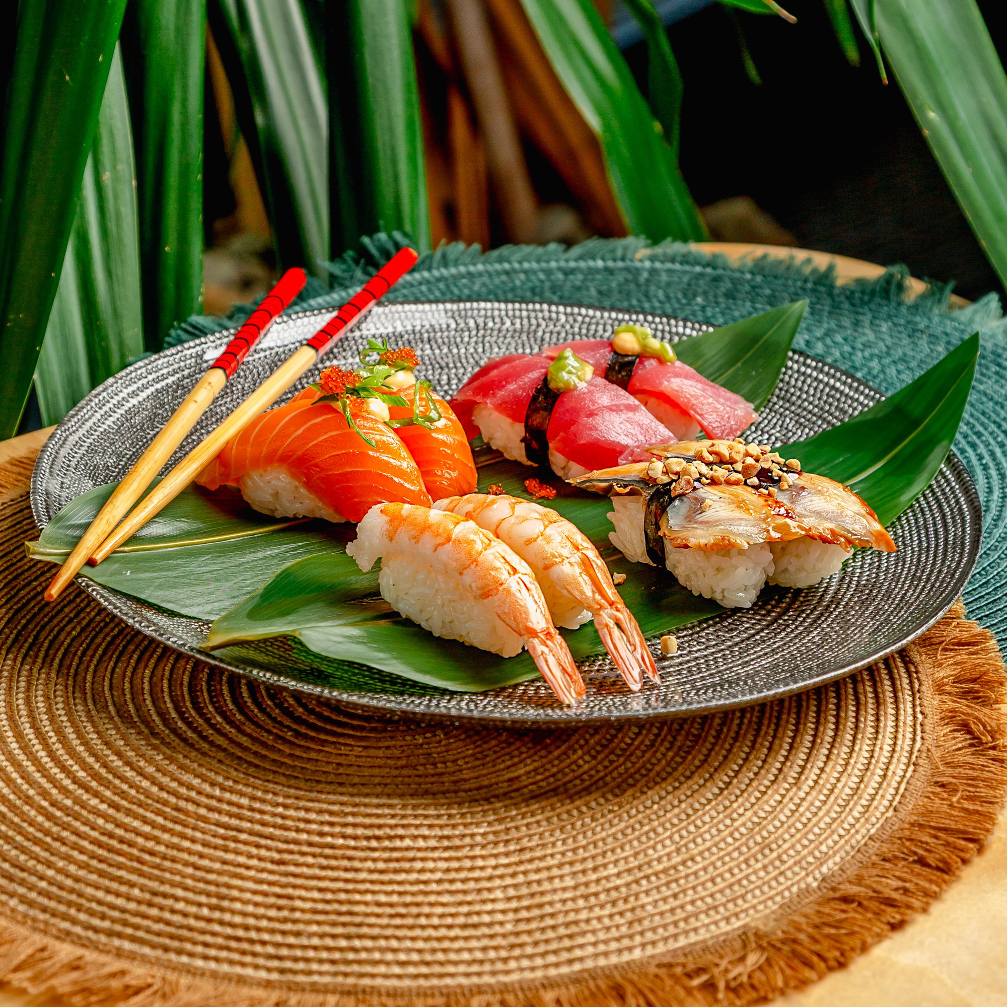 Ręcznie formowane porcje ryżu, na których umieszczony jest kawałek świeżej ryby, owoców morza lub warzywa.